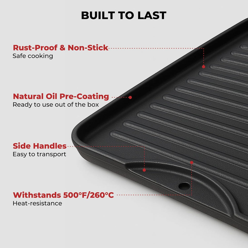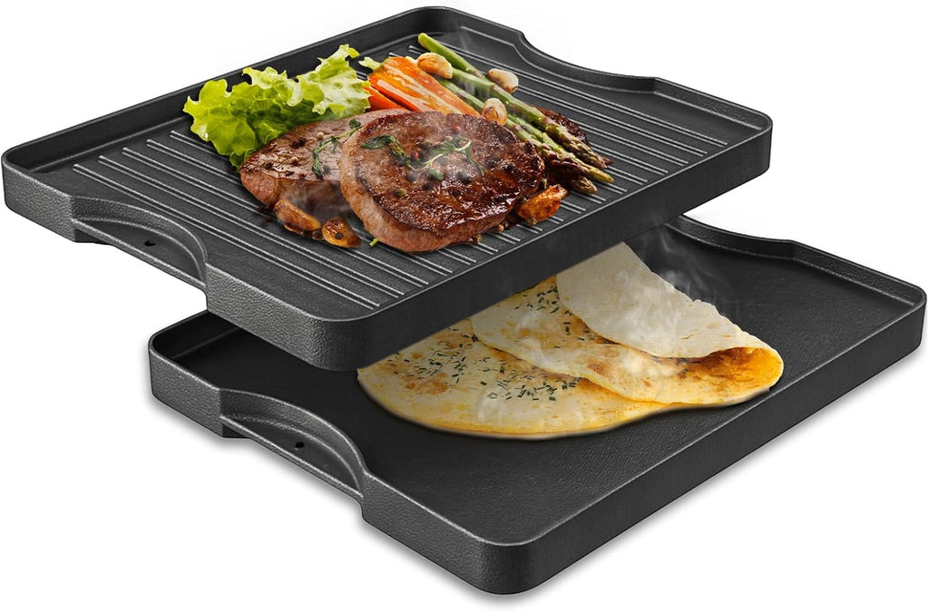 Ready-to-Use: The griddle for gas grill features a pre-seasoned oil finish, coming ready to use right out of the box. As a well-constructed cast iron griddle plate, it can deliver even heat distribution for cooking. Enjoy free styles of delicious and frying fun!