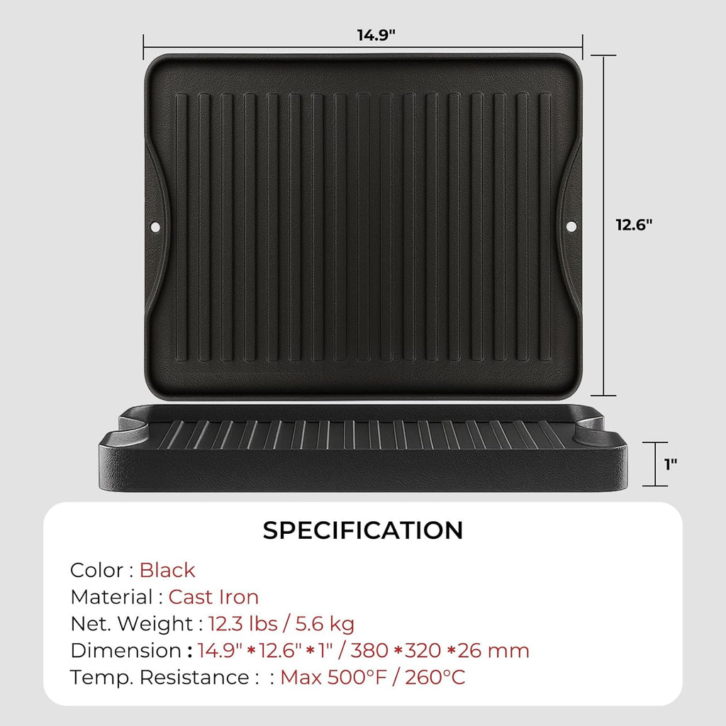 Spacious Area: The cast iron griddle for gas grill with 15" x 12.8" cooking area is wide enough for searing several steaks at the same time, or making time-saving breakfast for whole family