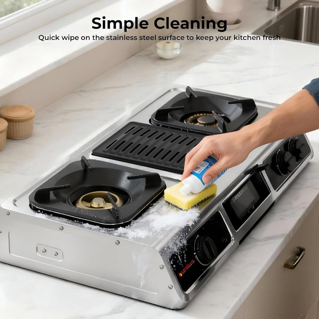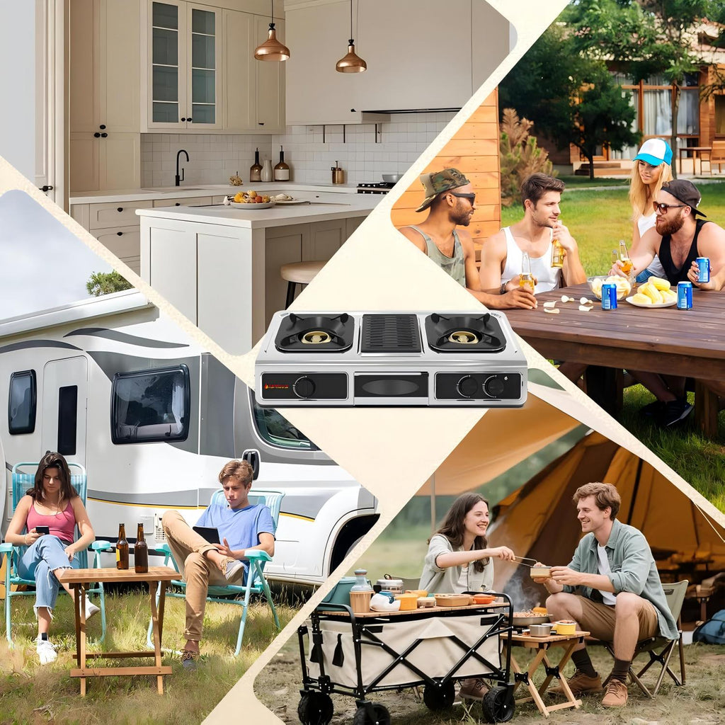 3-in-1 Versatility: It's More Than Just a Stove! The CAMPLUX 3-burner propane cooktop comes with a built-in grill plate, letting you BBQ and boil soup simultaneously. Elevate your outdoor cooking to the next level
