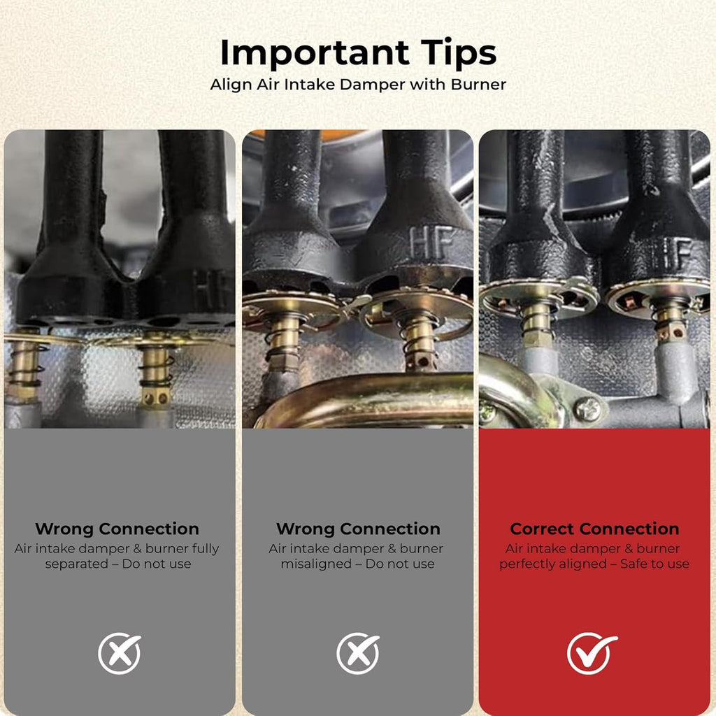 Important Tips: Please check the bottom of the outdoor camping gas stove before cooking. Refer to the last picture and make sure the air intake adjustment board and burner is well aligned. If it doesn't align, let us know and support
